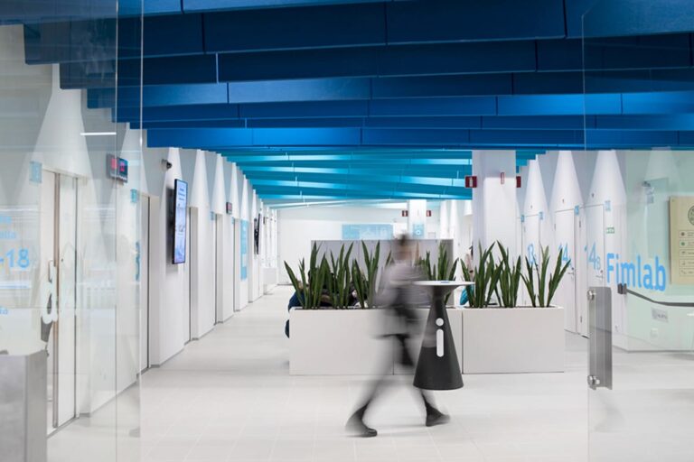 Fimlab has developed the Nopsa quick blood sampling concept, with spaces strongly reflecting a nature-inspired theme. The design incorporates calming elements such as birdsong and natural sounds, creating a pleasant and relaxing environment. In the largest locations, soothing music plays in the reception areas to complement the tranquil atmosphere.